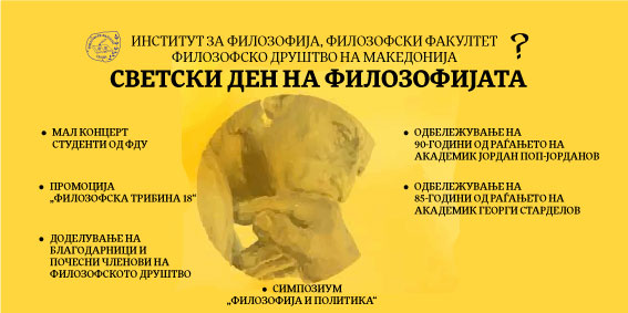 Светскиот ден на филозофијата, востановен од УНЕСКО во 2002 година, Институтот за филозофија при Филозофскиот факултет и Филозофското друштво на Македонија ќе го одбележат со пригодни дводневни активности на 19-20 ноември.