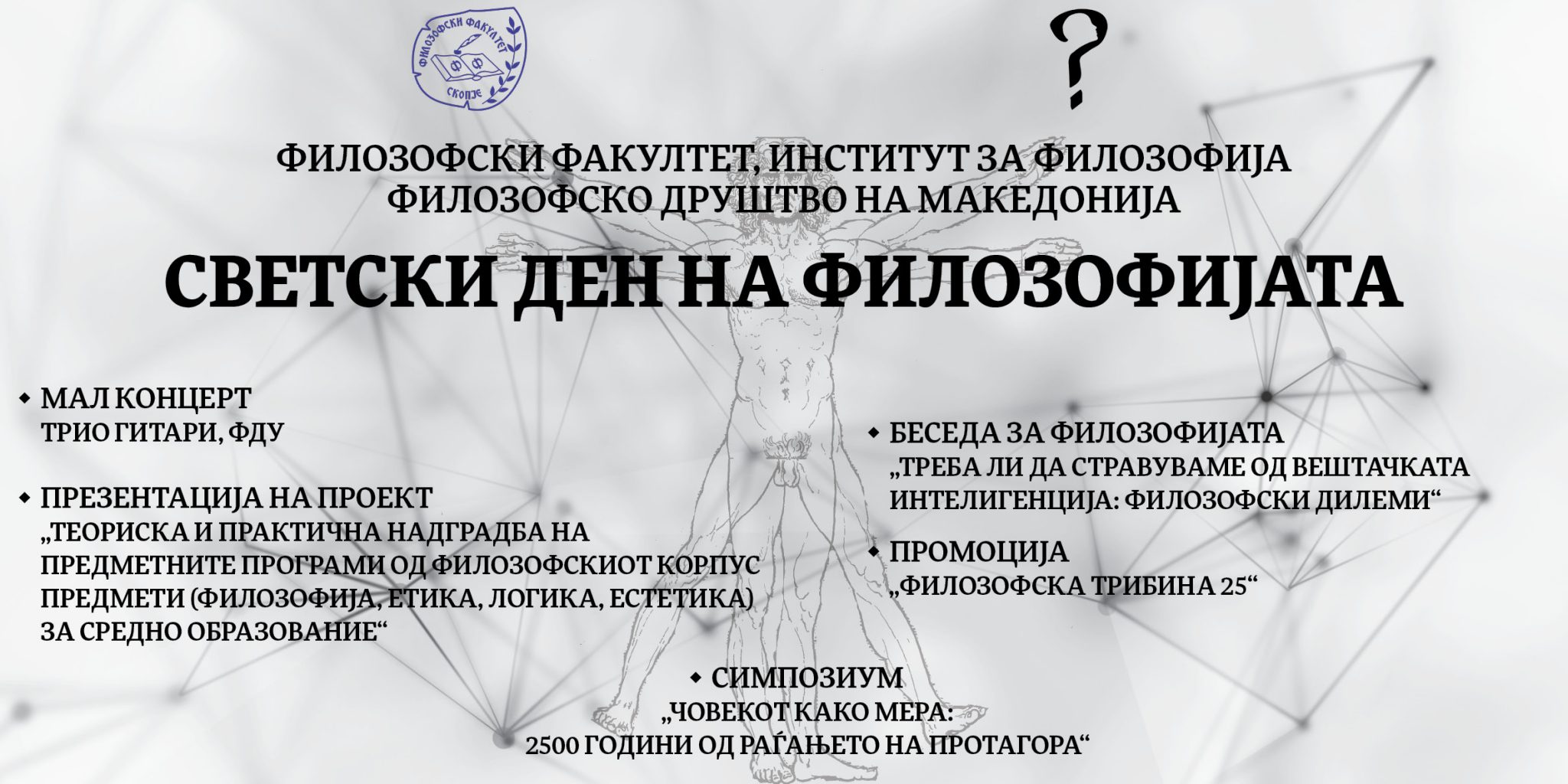 На симпозиумот на тема: „ЧОВЕКОТ КАКО МЕРА: 2500 ОД РАЃАЊЕТО НА ПРОТАГОРА“ во рамките на 16. одбележување на Светскиот ден на филозофијата, учество зедоа четиринаесет (14) реномирани филозофи, професори и истражувачи.