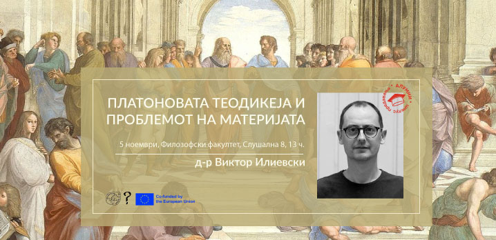 На 5 ноември (вторник, 13 ч., Филозофски факултет, Слушална 8), Филозофското друштво на Македонија и Институтот за филозофија при Филозофскиот факултет во Скопје организираат предавање со колегата д-р Виктор Илиевски (Marie Curie Postdoctoral Fellow, University of Vienna, Austria) на тема: ПЛАТОНОВАТА ТЕОДИКЕЈА И ПРОБЛЕМОТ НА МАТЕРИЈАТА.