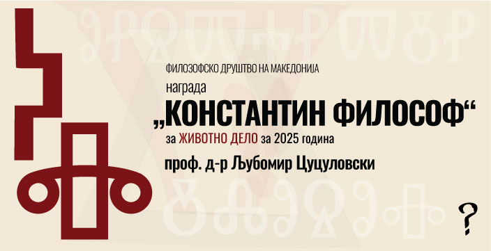 Филозофското друштво на Македонија информира дека добитник на наградата „Константин Философ“ за животно дело за 2025 година е проф. д-р Љубомир Цуцуловски. Конкурсот за наградите „Константин Филозоф“ беше распишан на 1 април 2025 год.,...